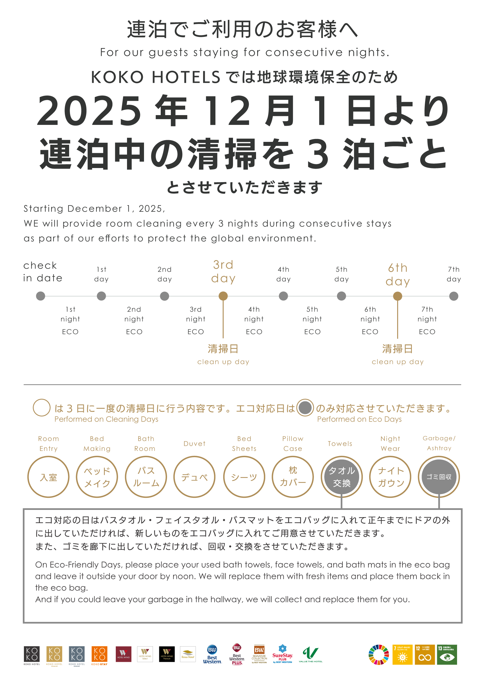 平素はKOKO HOTELをご利用いただきまして、誠にありがとうございます。 さて、私共では地球環境保全のため12月1日(月)チェックインより連泊の方の清掃を「3日に1度」とさせていただきます。 衛生上、タオル類は毎日交換させていただきます。詳しい運用についてはホテルにあるご案内をご参照ください。 ご利用のお客様にはご理解とご協力のほど、よろしくお願い申し上げます。