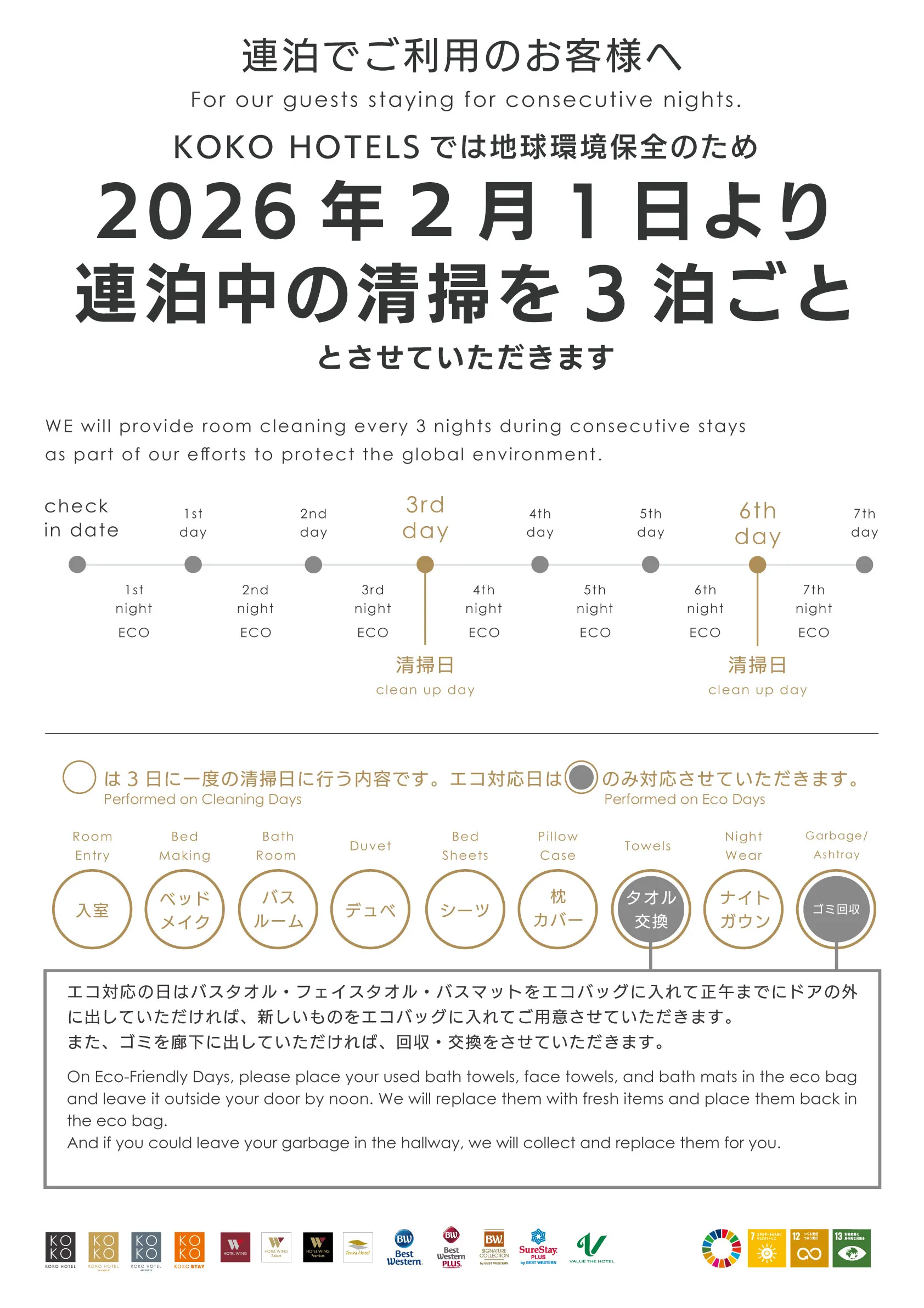 平素はKOKO HOTELをご利用いただきまして、誠にありがとうございます。 さて、私共では地球環境保全のため2026年2月1日(日)チェックインより連泊の方の清掃を「3日に1度」とさせていただきます。 衛生上、タオル類は毎日交換させていただきます。詳しい運用についてはホテルにあるご案内をご参照ください。 ご利用のお客様にはご理解とご協力のほど、よろしくお願い申し上げます。