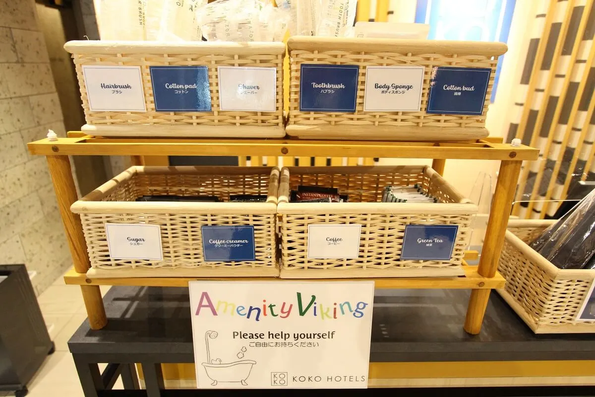 ロビーにはアメニティバイキングが設置されており、歯ブラシセット、綿棒、ボディタオル、カミソリなどの基本アイテムのほか、お茶・コーヒーセットもあり、必要なものを自由に選ぶことができます。貸出備品も充実しており、掃除機、空気清浄機、アイロン類など、暮らしの利便性を高める設備が揃っています。部屋での時間も快適に過ごせるよう配慮されています。