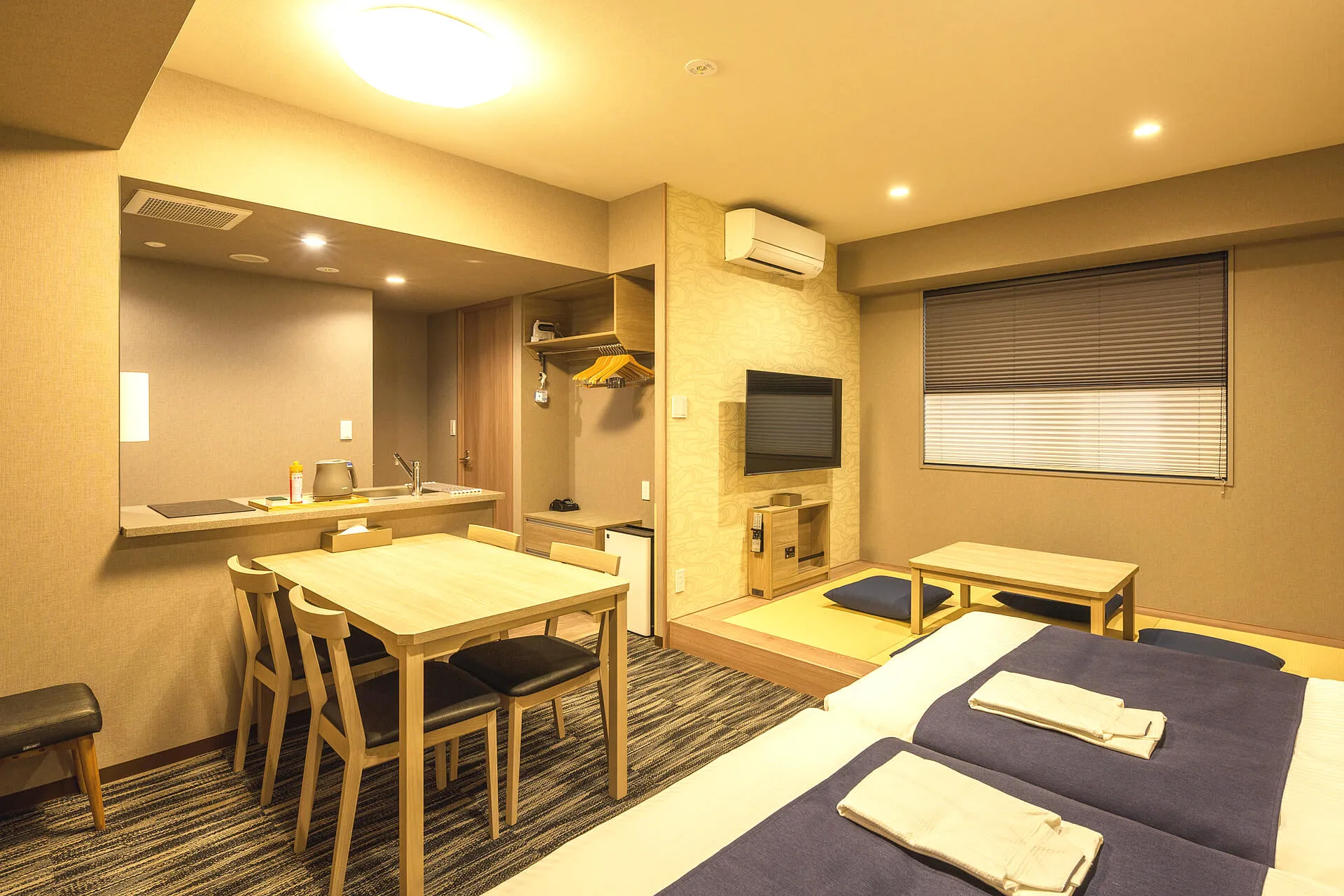 全体的に居住性を重視した設計で、スタンダードルーム、スーペリアルーム、スーペリアファミリージャパニーズルーム、スーペリアジャパニーズルーム、プレミアジャパニーズルームなど、多様なタイプのお部屋を用意しています。最大5名まで宿泊可能な広さの部屋もあり、グループ旅行にも適しています。全室に無料Wi-Fi、キッチン設備、洗濯機、電子レンジ、冷蔵庫、トースター、電気ケトルなどが完備されており、自炊や簡単な調理も可能です。畳スペースや布団を利用できる和の要素を取り入れた部屋もあり、落ち着いた空間でゆったりと過ごせます。