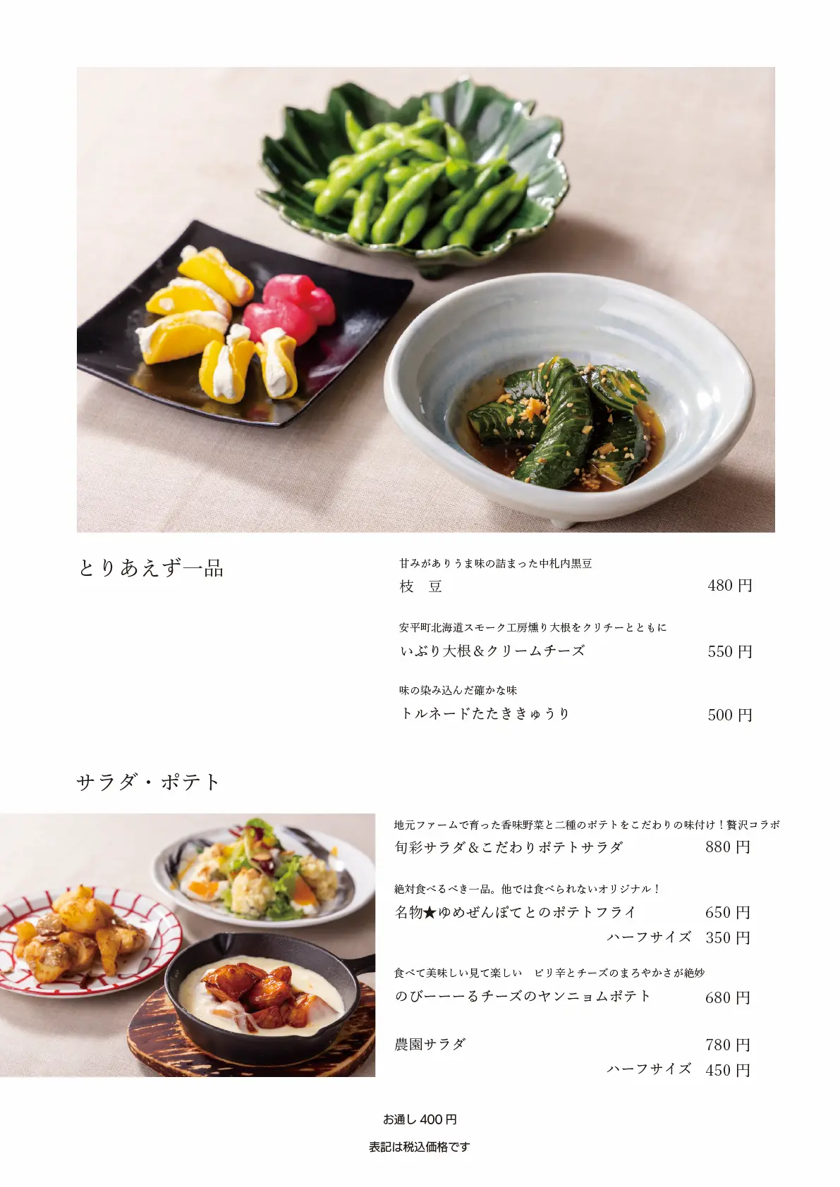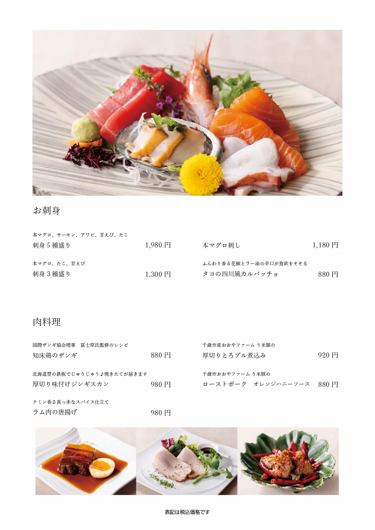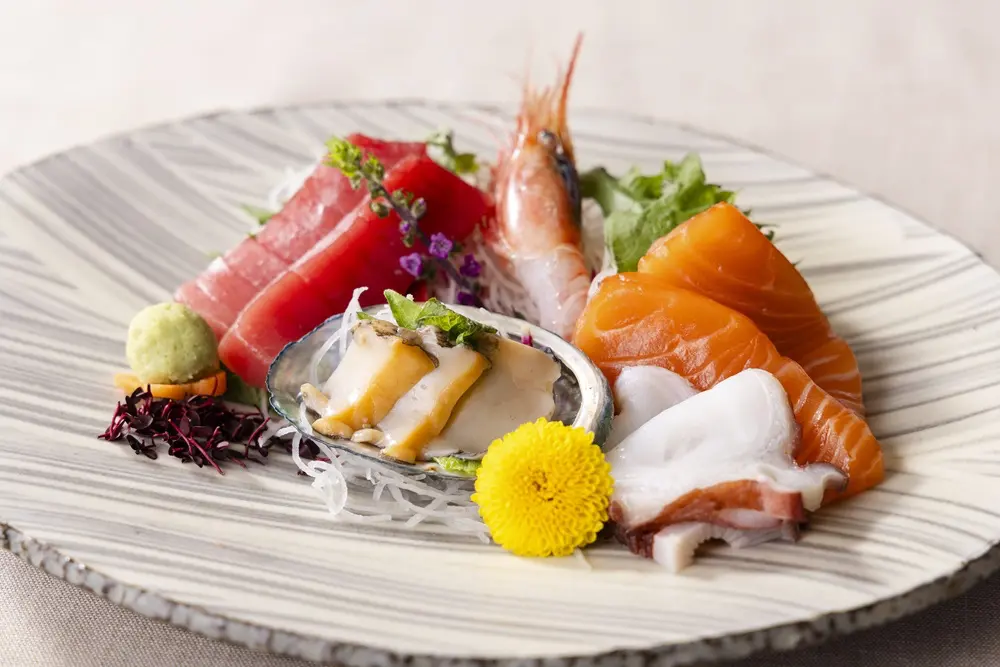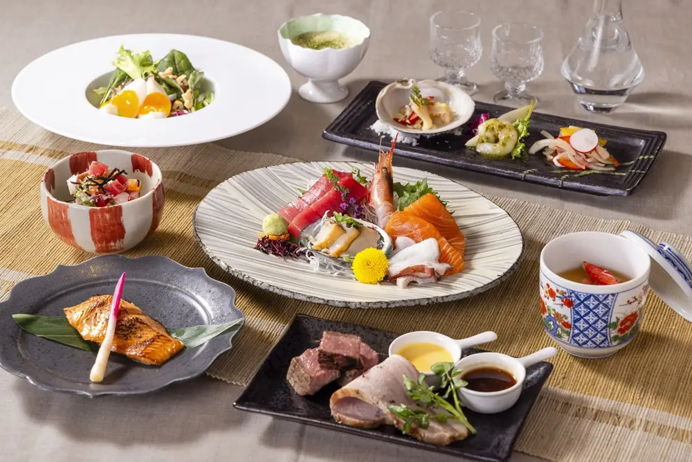 先付/刺身三種(本マグロ、サーモン、甘えび)/赤魚西京焼き/知床豚のロースト/旬野菜とモッツァレラのサラダ/茶そば/アイスクリーム