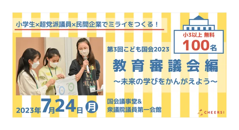 株式会社CHEERSが主催する、小学生×超党派国会議員×各省庁×民間企業でミライをつくるイベント「夏休みこども国会2023」などに協賛し、政治に関心を持ち、意欲的に学ぶ小学生を応援しています。