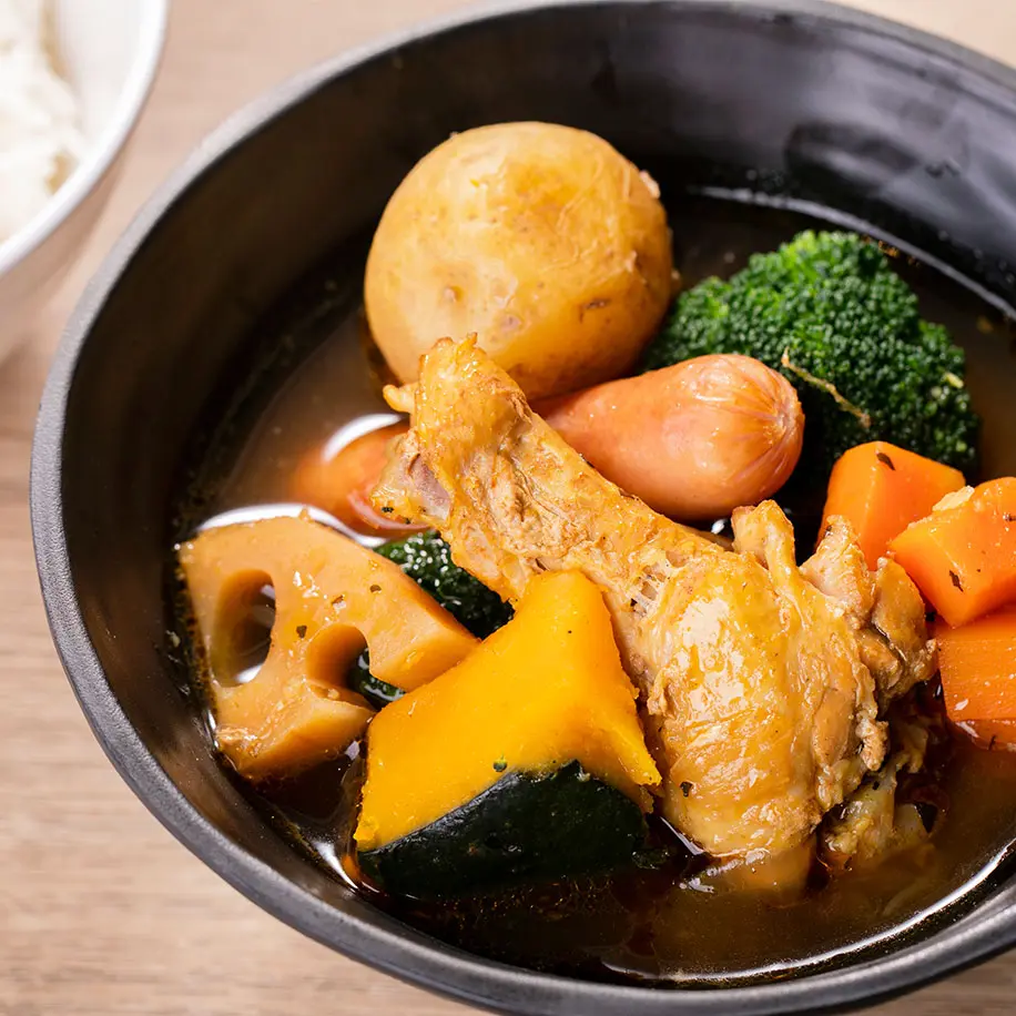 北海道・札幌発祥のカレー。中国・朝鮮の薬膳スープや南インド・タイなどの汁気の多いカレーがヒントとなっています。皮付きポテトやブロッコリーなどの具材をご用意し、充実したスープカレーを作ることができます。