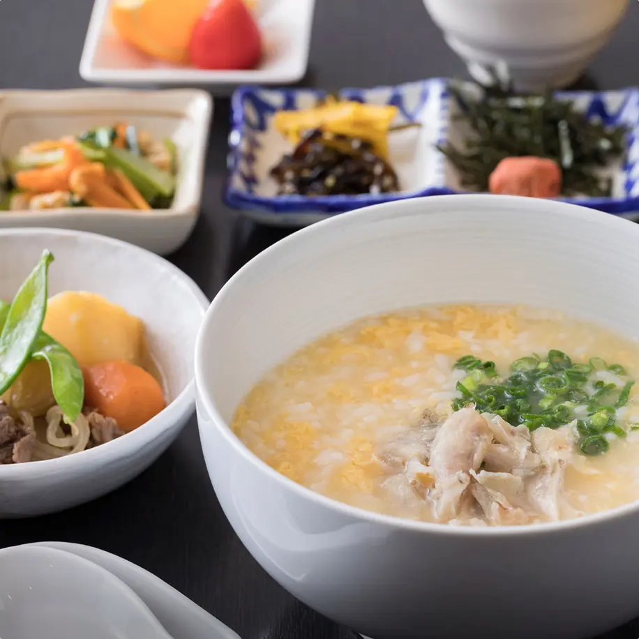 ホテル周辺の名店、錦松梅さんの佃煮ふりかけ、妻家房さんの梅干しキムチ、関根の胡麻油さんの煎り胡麻と名だたる一品をご用意。それ以外にもホテル自家製牛肉しぐれ煮、高菜明太、鳴門海峡塩昆布、ビビンバ、若狭湾釜揚げしらすなどなどご飯のお供が勢ぞろい。お粥でサラッと朝食を楽しむことができます。