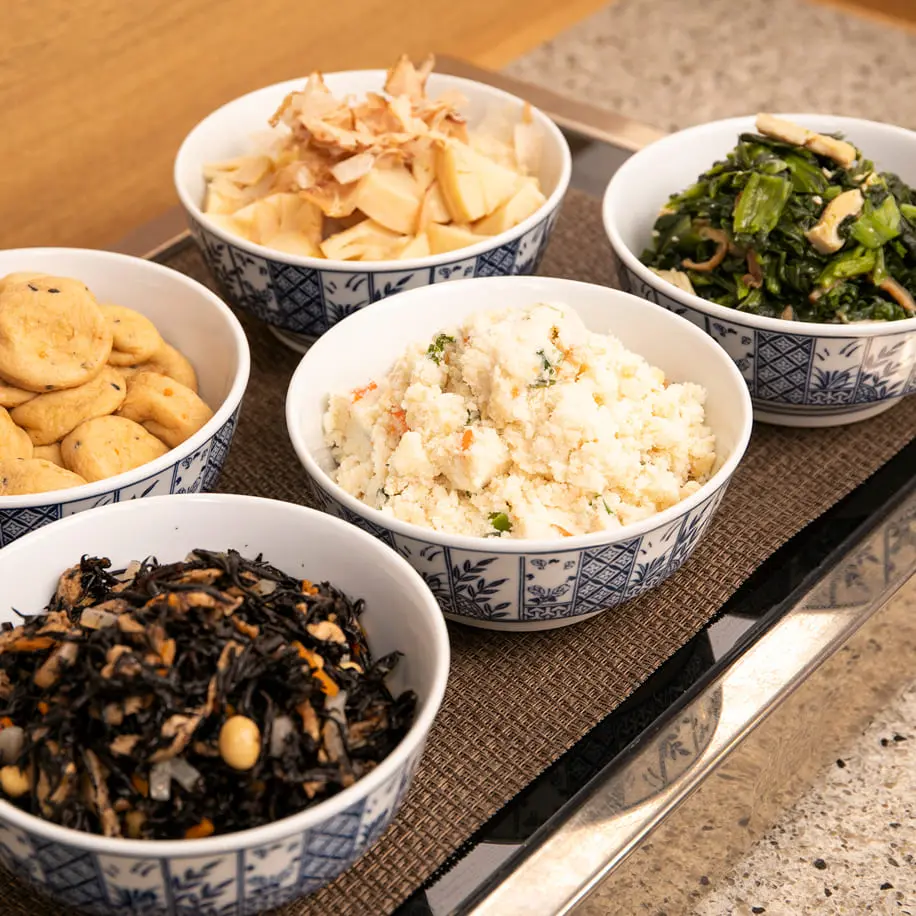 京都ならでは!おばんざいを数種類ご用意。炊き立てのご飯と一緒にお好きなだけお召し上がりください。