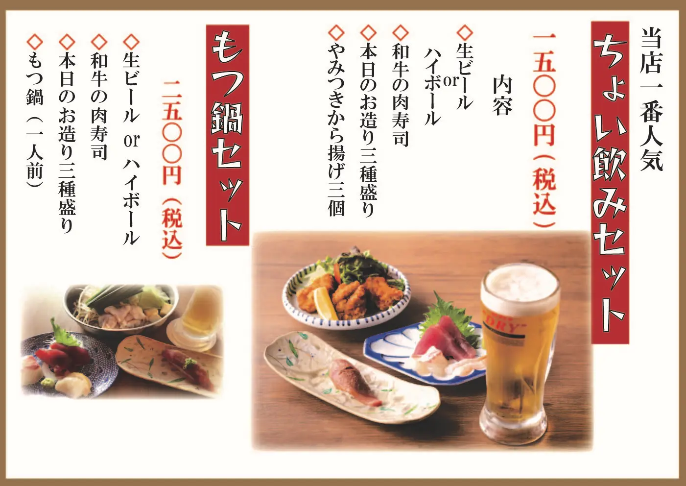 生ビールorハイボール、和牛肉寿司、造り盛り3種、から揚げが付いて1,500円!