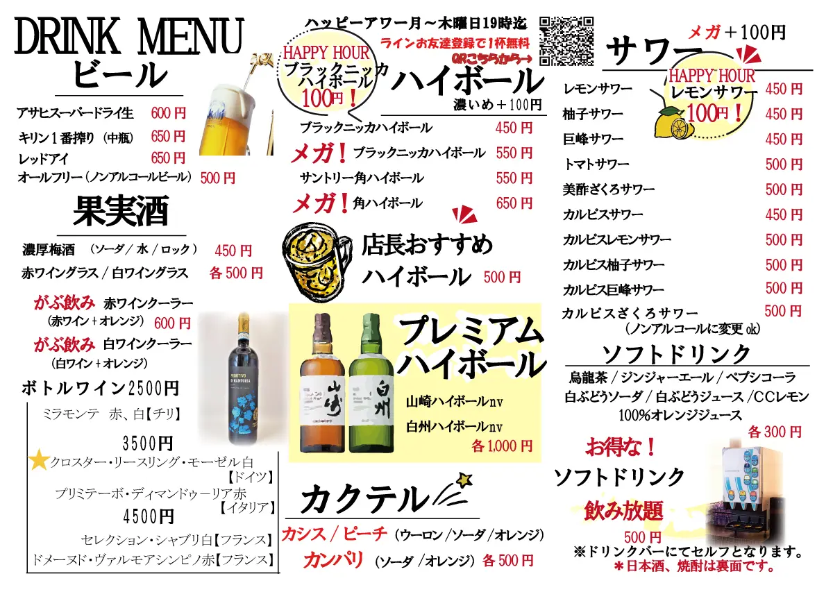 【平日 月曜~木曜限定】17時~19時迄ハイボール、レモンサワー何杯飲んでも1杯100円!