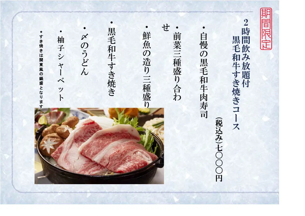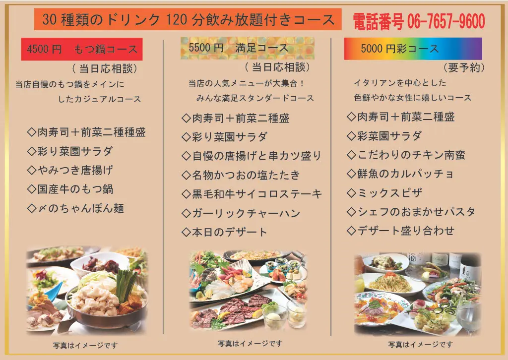 全てのコースが2時間飲み放題付き!各種ご宴会にぜひご利用ください。