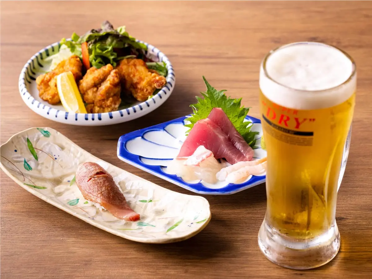 生ビールorハイボール、和牛肉寿司、造り盛り3種、から揚げが付いて1,500円!