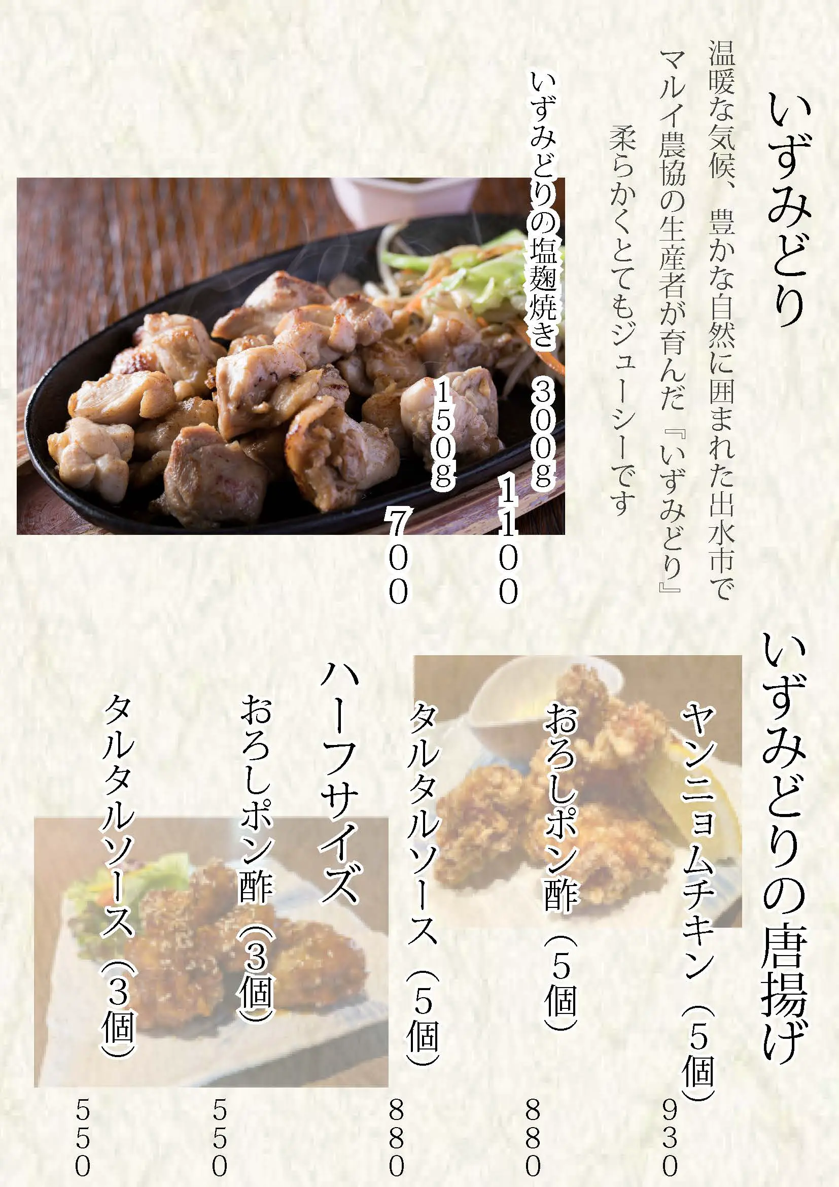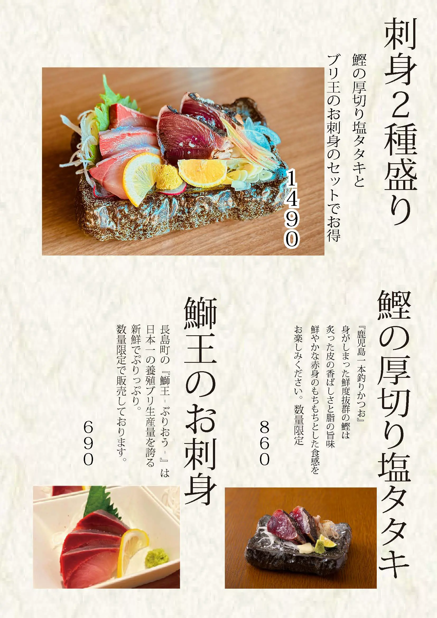 地元の産直野菜を使い、新鮮なブリの刺身や鹿児島の郷土料理で有名なキビナゴの天ぷらもお召し上がりいただけます。