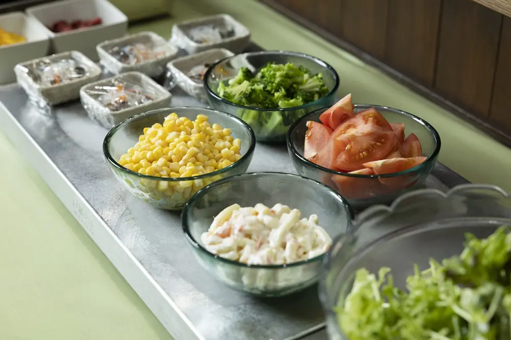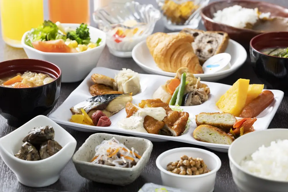 1階のレストラン「ゆめぜん」では、毎朝6:30~9:30(ラストオーダー9:00)に、和洋ビュッフェスタイルの朝食をご提供しています。地元・都城の食材をふんだんに使用したメニューが揃い、焼き魚や出汁巻き卵、小鉢の和惣菜、季節のサラダ、味噌汁、白米など、栄養バランスも考えられています。