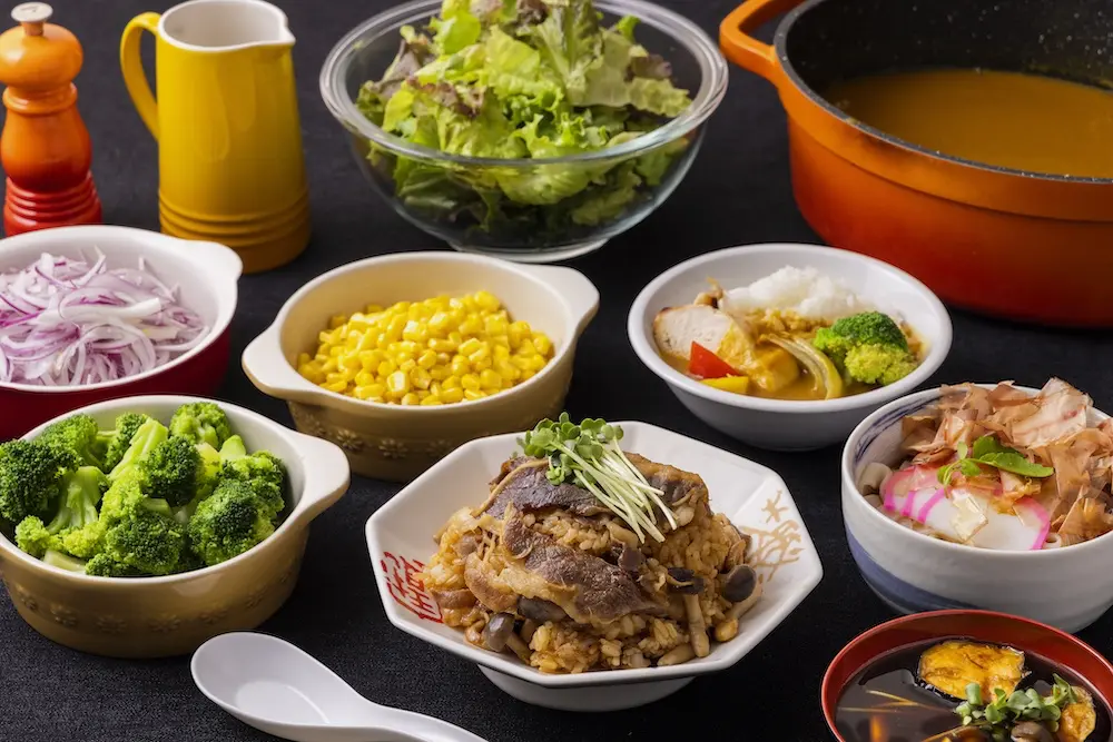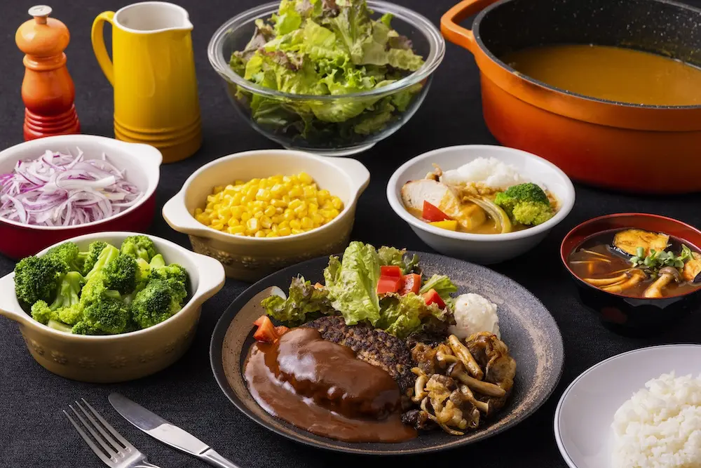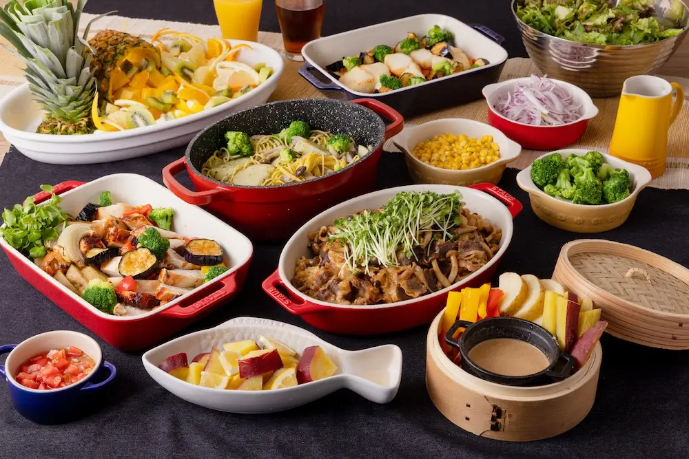 サラダ / 肉類2種 / 魚類1種 / パスタ / ピラフ / 副菜 / 汁物 / ご飯 / 飲み物