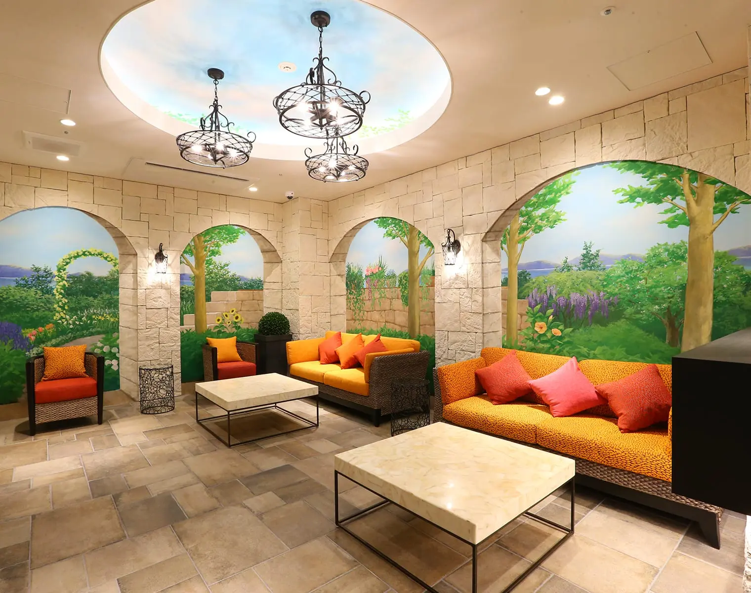 ARTIST/PAINTER/MURALPAINTER 笠井麻衣氏の制作風景をご覧いただけます。ホテルのテーマでもある12種類の花が描かれておりトロンプ・ルイユ(だまし絵)で描かれた壁画は、まさに庭園にいるかのような情景です。