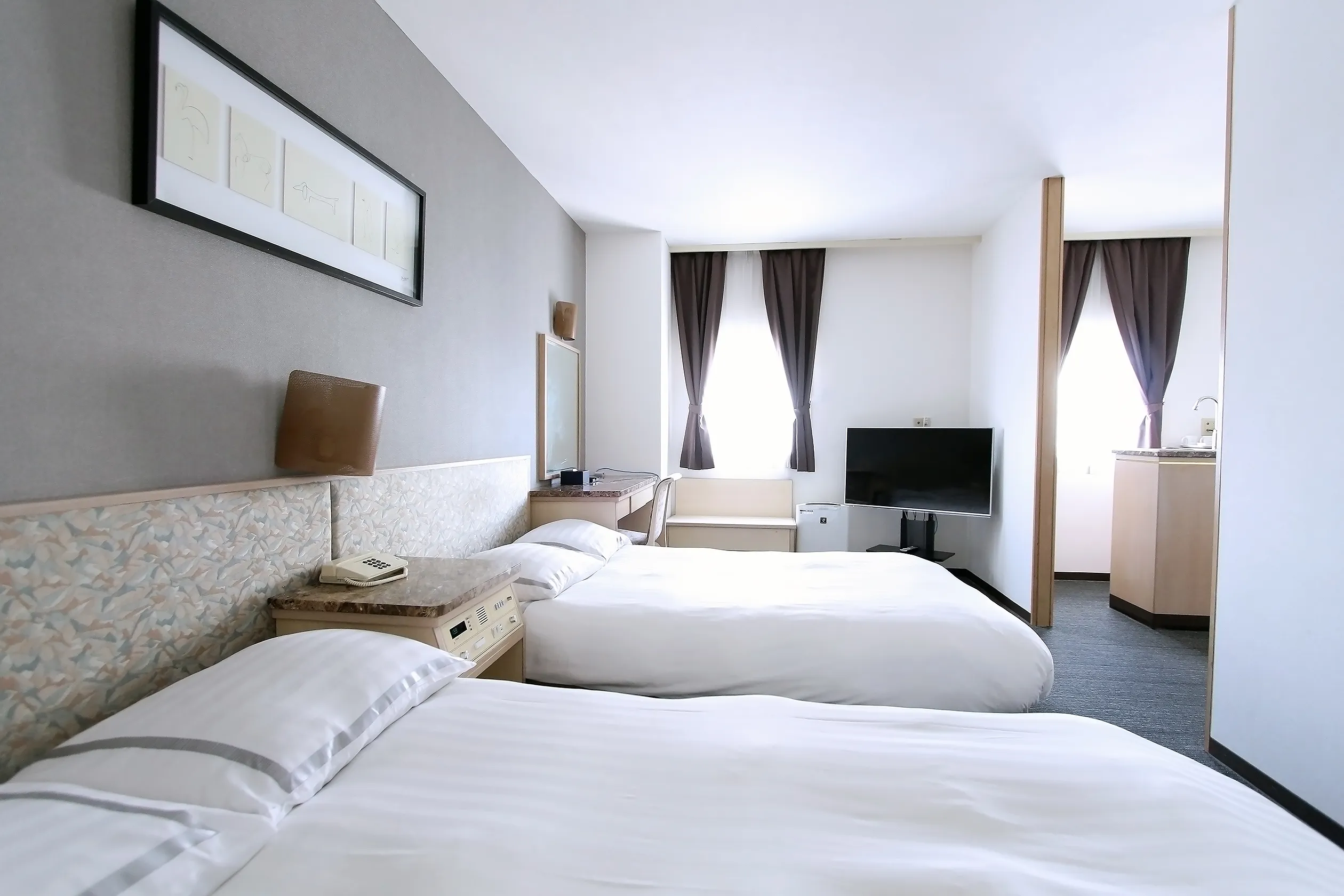 客室は、シングル、ダブル、ツイン、ツインデラックス、和室の5タイプがあり、全92室を完備しています。全室角部屋で南向き、幅広140cmのダブルベッドを採用しており、カップルやご夫婦にも人気です。シンプルながらも機能的なデザインにより、快適に過ごせる空間を提供します。全室に無料Wi-Fiを完備し、ビジネスでの作業やオンライン会議も快適です。シャワーブースや加湿空気清浄機、セーフティボックス、充実したコンセントなど、長期滞在にも対応可能な設備が整っています。落ち着いた色調と間接照明が居心地の良さを演出します。