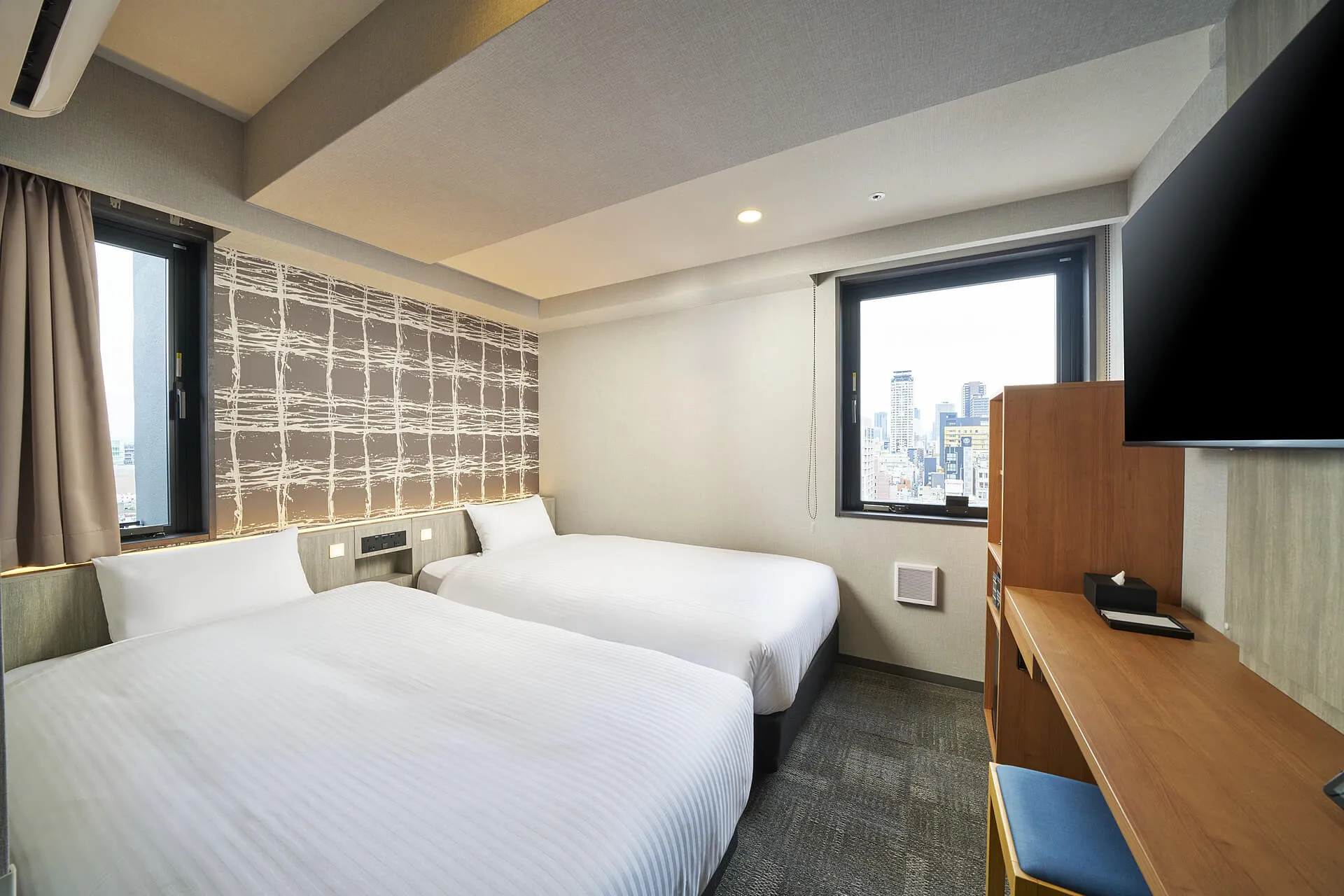 ホテルの客室は、スタンダードツイン、スーペリアツイン、デラックスツイン、デラックスツインユニバーサルデザインの4タイプを完備。全室禁煙で無料Wi-Fiを提供しており、快適な滞在をサポートします。スタンダードツインは14.82㎡、スーペリアツインは16.48㎡、デラックスツインは16.77~17.21㎡と広々とした空間で、シンプルながらも心地よいインテリアが特徴です。また、ユニバーサルデザインの客室もあり、車椅子での滞在にも配慮されています。ビジネス利用はもちろん、観光やカップル、ファミリーでの滞在にも対応します。