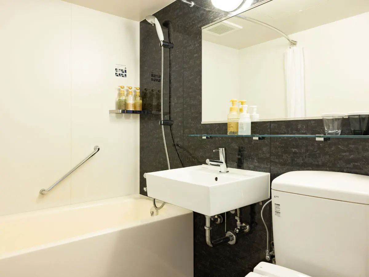 - 男性にも女性にも共に受け入れられる中性的な色遣い。特徴ある鏡の形とそれに合わせたカーテンの柄が楽しめます。