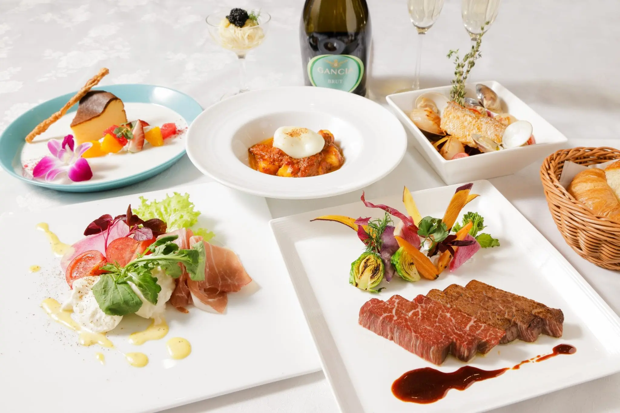 お魚料理にメインは厳選和牛。シェフ特製のパスタもついたスペシャルな内容です。