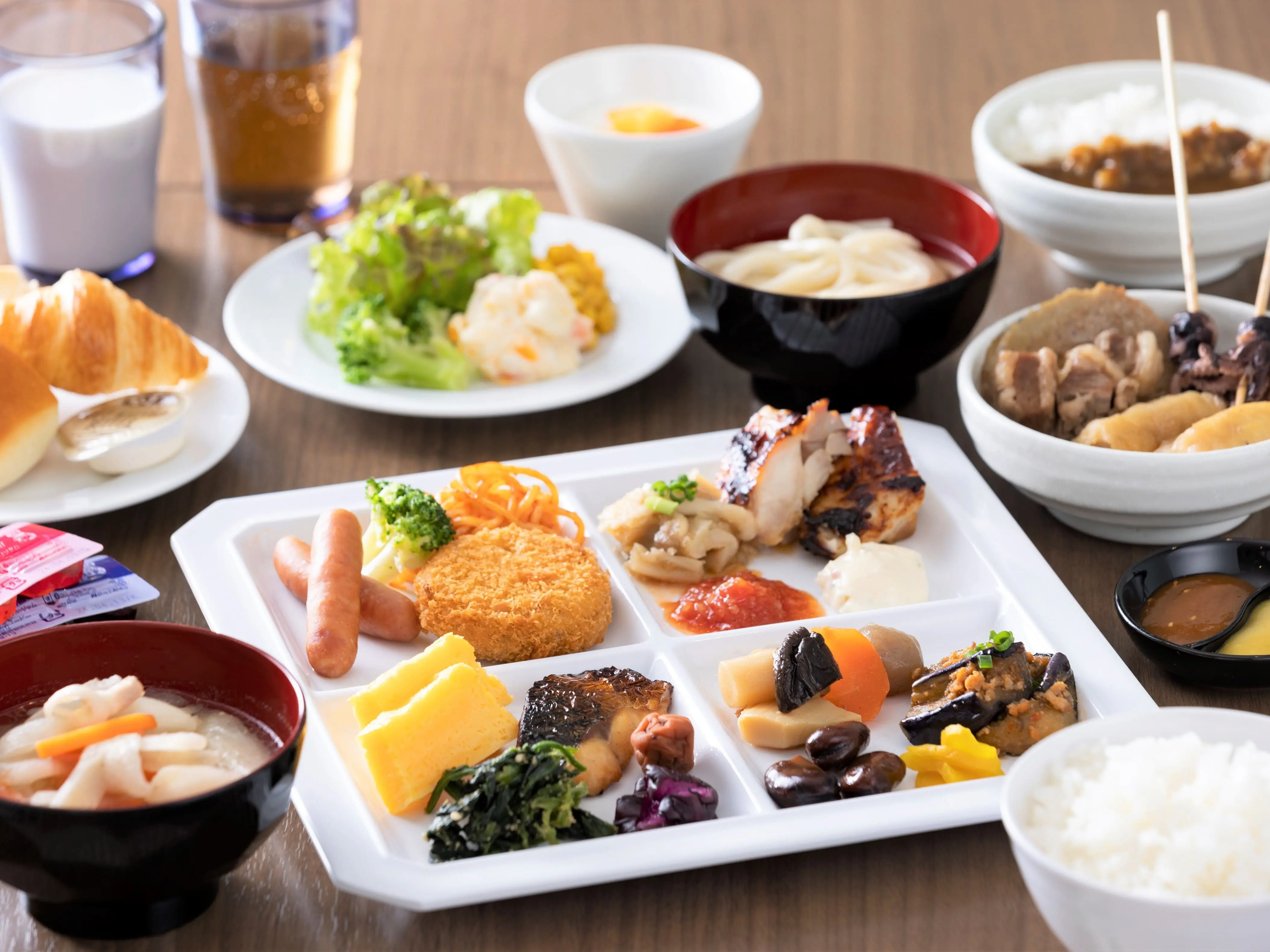 朝食は6:30~9:30(ラストオーダー9:00)に提供され、地元・讃岐の素材を活かしたご当地メニューが並びます。セルフうどんコーナー、讃岐おでんコーナーのほか、パンやサラダ、ご飯のお供などバランスの取れた内容です。料金は通常1,500円(税込)。瀬戸内の朝の空気とともに、一日の始まりを心地よく迎えるひとときです。